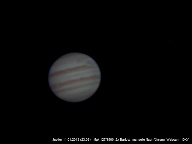 Jupiter 11.11.2012 (23:05) Aufnahme mit: Skywatcher Skymax 127 (2x Barlow) auf Astro5 DX, manuelle Nachführung, mit Logitech C270 USB HD Webcam (wxAstroCapture) + IR-Filter Bildbearbeitung: RegiStax 6 und Fitswork4