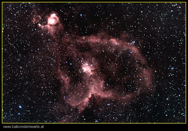 Optik:80/400mm Sky Watcher Refraktor, Kamera: Canon 450D ohne Filter, Belichtungen: H-Alpha Filter 7nm 6x480sek., IDAS LP2 Filter 35x480sek bei iso 1600 incl. Darks und Flats, Montierung: CGEM, Nachführung: 102/1300 Sky Watcher Mak., ALccd5 und PHD, Bearbeitung: DSS, Fitswork und PS.