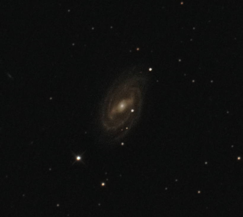 Gestackt mit DSS, EBV: Fitswork (Gradation, Schwarzwert, Ebnen Variabel, Schwarzwert, Gradation), Gimp (Hochpass, Überlagerung der Galaxie auf Bild mit auf Sternen optimierter Gradationskurve, Ausgeschnitten, Wavelet, Skaliert)