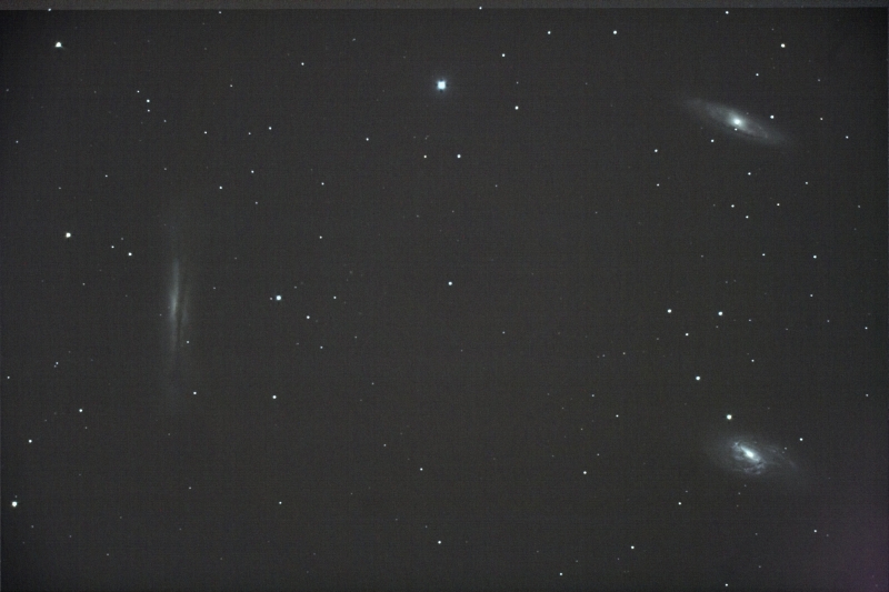 Test Aufnahme am Triplett mit C8 und Alan Gee bei ca F/6 mit EOS 350D. 20 x 60 Sekunden und 20 x 40 Sekunden mit ISO 800. Leichter Dunst und Streulicht machten längere Belichtungen unmöglich. M65 und M66 sind Ausschnitte.
