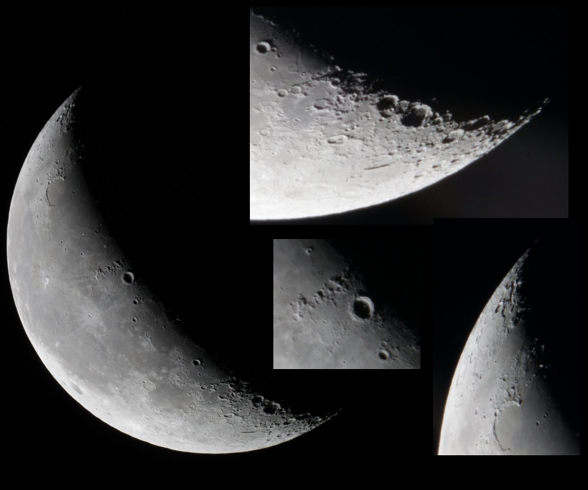 Am heutigen Samstagmorgen nutzte ich das gute Wetter und den hochstehenden Mond (zu 31 % beleuchtet) um ein paar Aufnahmen zu machen. Verwendet wurde wie immer der Mak 127/1500mm und auch wieder die billig-2x-Barlow die wenigstens heute mal halbwegs zu gebrauchen war und ich konnte die Reflektionen etwas vermeiden. Die Schärfe ist aber trotzdem nicht der Brüller was man bei dem Preis auch nicht erwarten darf.