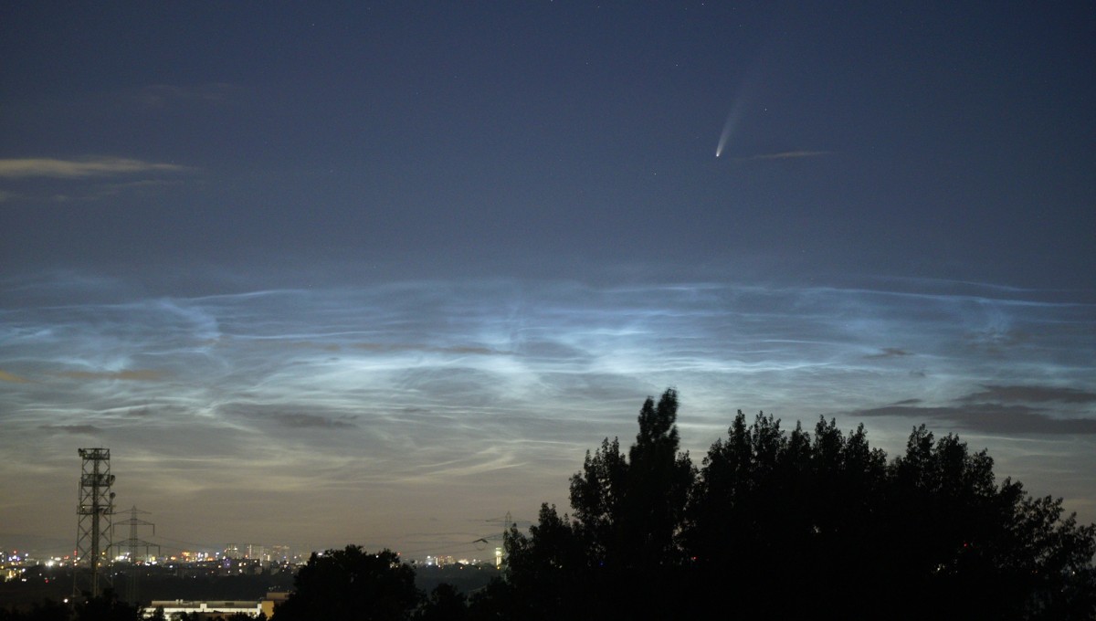 Der Komet Neowise über sehr hellen NLCs über den Lichtern von Hamburg