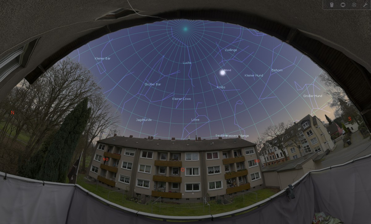 Habe mir die Mühe gemacht und ein Panoramabild von meiner Balkonsternwarte in Stellarium importiert, damit ich weiß...wenn mal ausnahmsweise clear sky (CS) ist...was und ob es sich lohnt etwas Fotonen einzufangen!