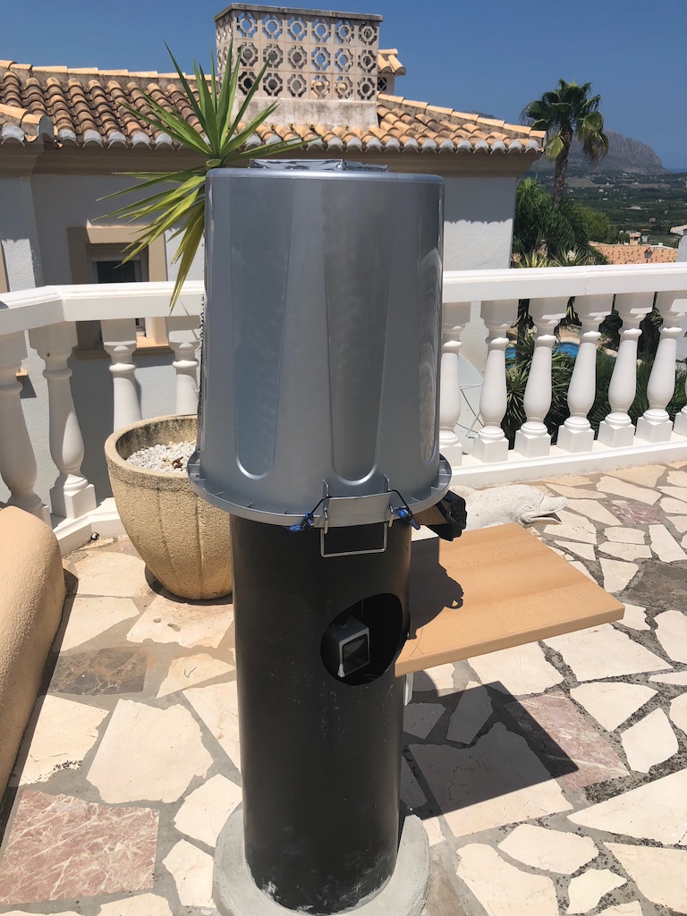 Als Schutz für die EQ3 Montierung dient die berühmte "Oskartonne". Ober drauf sitzt ein Solarmodul, das einen alten PC-Lüfter mit 12 Volt antreibt der im oberen Teil sitzt und an heissen und sonnigen Tagen für etwas mehr Luftzirkulation sorgt.Die eigentliche Säule ist ein 11cm KG-Rohr mit Beton aufgefüllt. Dieses steckt in einer weiteren Säule die von der inneren entkoppelt ist und ebenfalls unten zusätzlich zur Stabilität ebenfalls bis ca. 30cm Höhe mit Beton aufgefüllt ist. Das ganze ist ein Kompromiss, da ich auf dem Terrassenboden kein weiteres Fundament einbauen konnte und meine Frau diese Lösung etwas schicker fand. Die EQ3 sitzt auf 4 x 12mm Gewindestangen mit einer Länge von jeweils 50cm, die 40 cm im Beton eingegossen sind. Als Plattform habe ich eine alte 20cm Stahls-Trennscheibe von einem Winkelschleifer benutzt, die von unten noch mit 2 größeren Platten verstärkt ist. Die dienten ursprünglich als Befestigungssystem für einen Rechner im 19" Schrank.