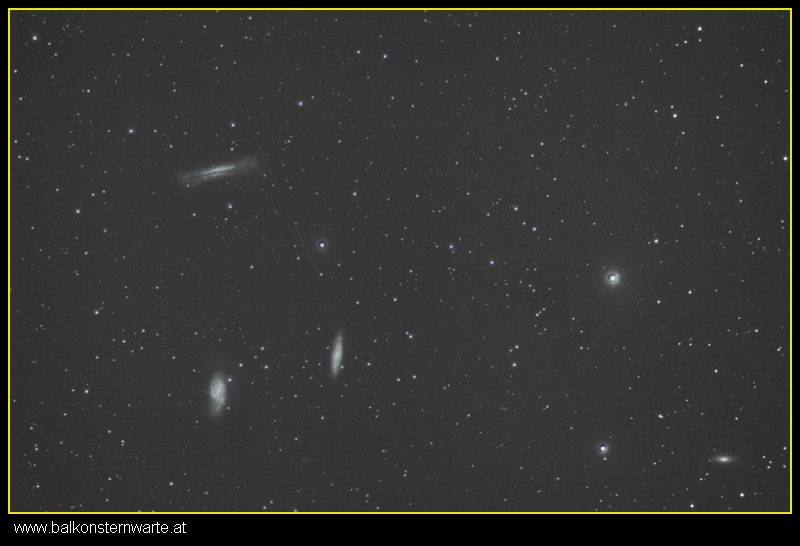 So hielt ich halt mal auf das Leo Triplett Ich weis dass man da mit der doppelten Brennweite besser bedient wäre. Ich machte 20 Aufnahmen iso800 a. 300sek. und Darks. Das Triplett mit den Galaxien M65, M66 und NGC3628 ist zusehen und im unterem rechten Eck hat sich sogar noch NGC3593 noch dazugesellt.