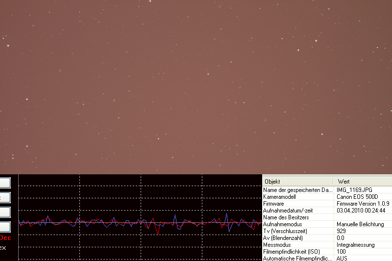 30 x 30 Sekunden belichten + 35 Sekunden Pause für den Darkabzug + 2 Sekunden Spiegelvorauslösung = 33,5 Minuten, die PHD das ganze managen musste. In dieser Zeit gab es eine Abweichung beim Guiden, die sich in Pixel auf dem Chip der EOS angeben lässt: es sind ca 4 Pixel in RA und ca 4 Pixel in DEC ind der Mitte des Bildes. Da die Abweichung sich durch eine Bidfeldrotation zwischen diesen 33 Minuten bemerkbar machte, deren Mittelpunkt außerhalb des Bildes liegt (Leitstern war aber ziemlich in der Mitte von M44), ist die Abweichung nicht PHD zuzuschreiben, sondern eher meinem Setup - also gibts ein lachendes und ein weinendes Auge: