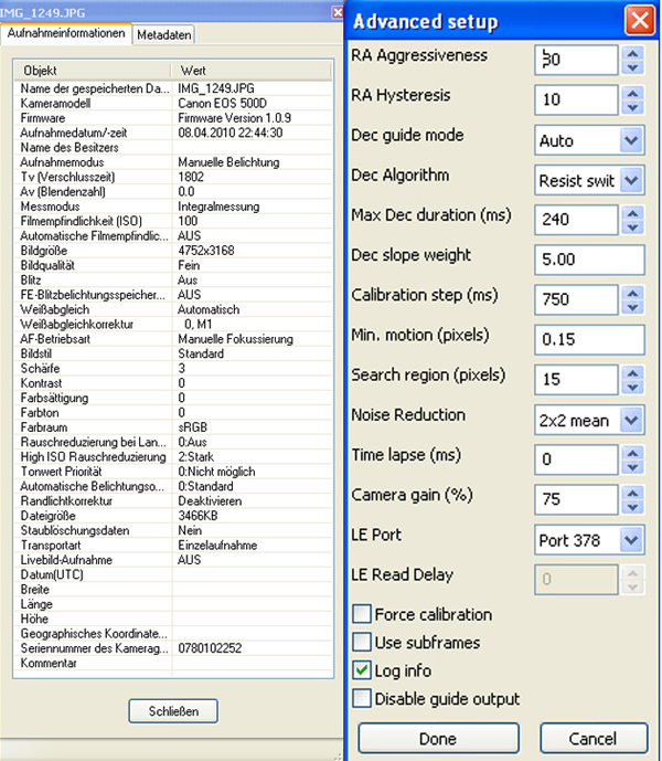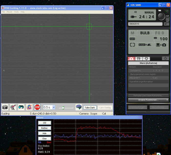 Dann ging es ans Guiden. Hatte die gleichen Werte von meinem Nachführungstest, vom 03.04.10, noch drin.