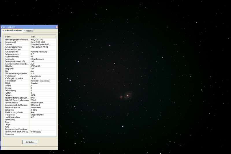 Zum "Warmlaufen" der Monti hab ich dann erstmal auf M51 gehalten. 817sek. bei ISO100. Bis dieser dann aus dem Sichtfeld verschwand. Hab einen Balkon über mir.
