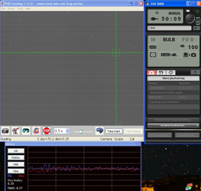 Alles in Ruhe aufgebaut, eingenordet und GOTO eingerichtet. PHD gestartet, einen kleinen Leitstern angeklickt und die Kalibrierung abgewartet.