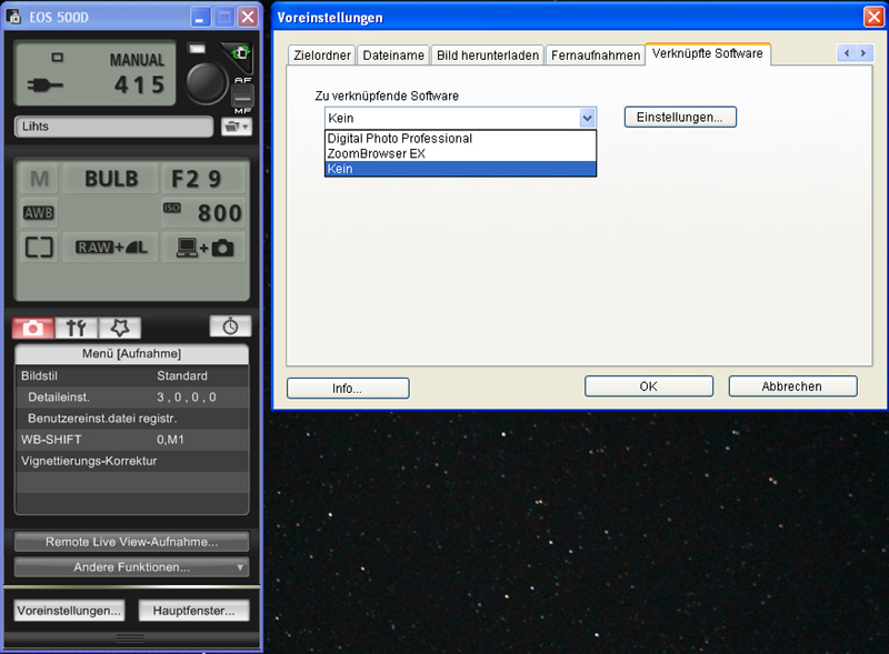 Unter EOS Utility auf Voreinstellung gehen (links unten). Dann auf "verknüpfte Software" "keine" auswählen.