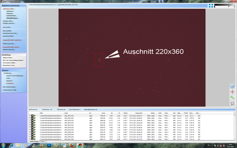 Ich habe mir mal eine Aufnahme von den NGCs 4631 4627 4656 4657 zur Brust genommen, denn die hatte ich bereits durch DSS durchgejagt und daher war ein neuer Durchlauf mit aktivierter Drizzle-Option ein Klacks.