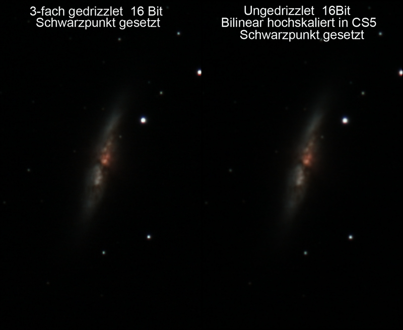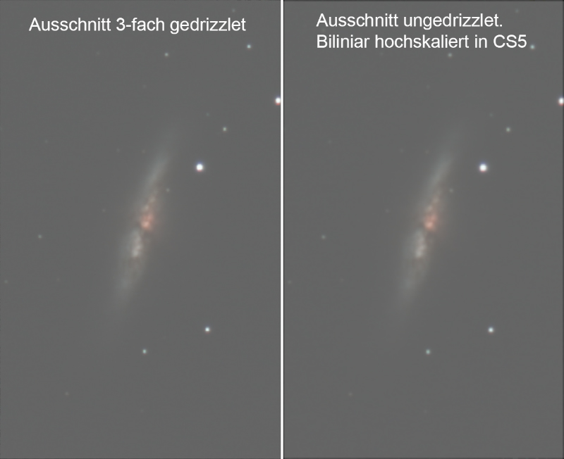 Hier bei den JPGs ist für mich praktisch gar kein Unterschied zu sehen. In den Fits-Dateien konnte man sich einbilden, dass die gedrizzelten Bilder ein bisschen schärfer waren. Das war aber minimalst, wenn überhaupt.