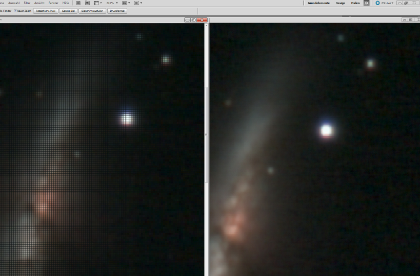 Die linken Bilder sind jeweils ungedrizzelt, die rechten Bilder gedrizzelt, jeweils Ausschnitte. Dabei ist die obere Reihe in 100% Größe wie das RAW (also das gedrizzelte Bild wurde da verkleinert), in der unteren Reihe sind die Bilder 200% der RAW-Größe (das nicht gedrizzelte Bild wurde also doppelt so groß gemacht, das gedrizzelte Bild war ja eh' schon doppelt so groß).