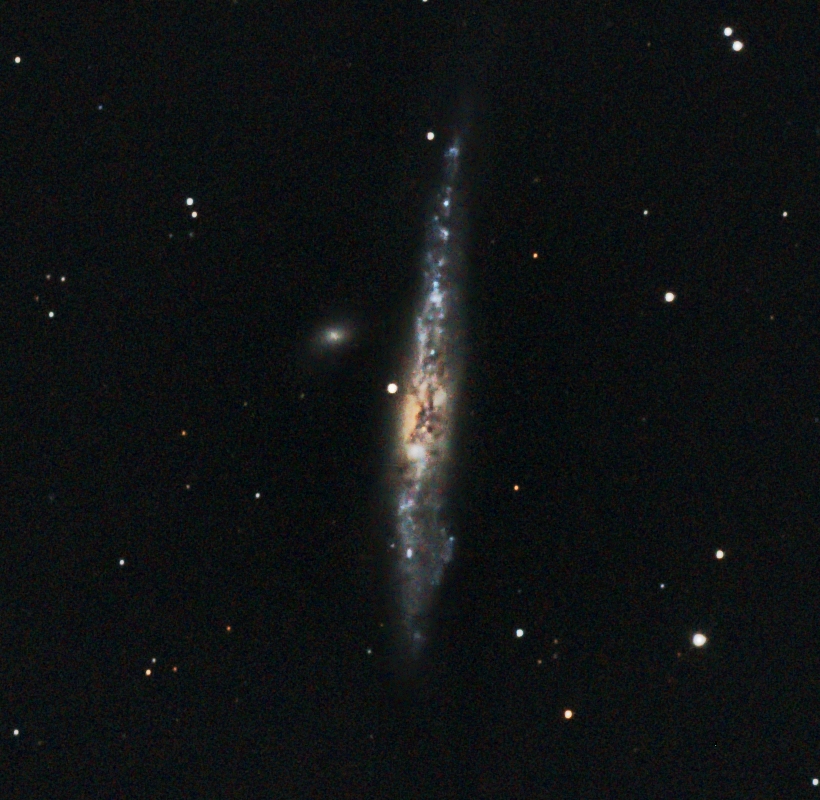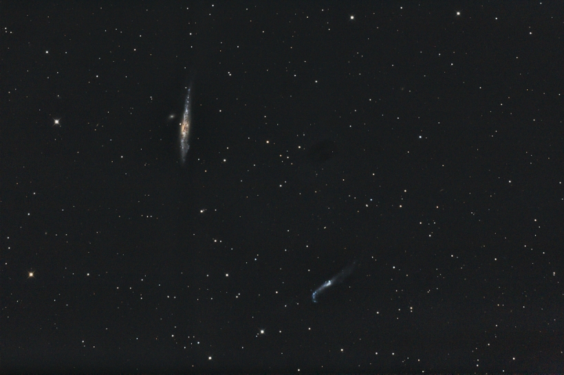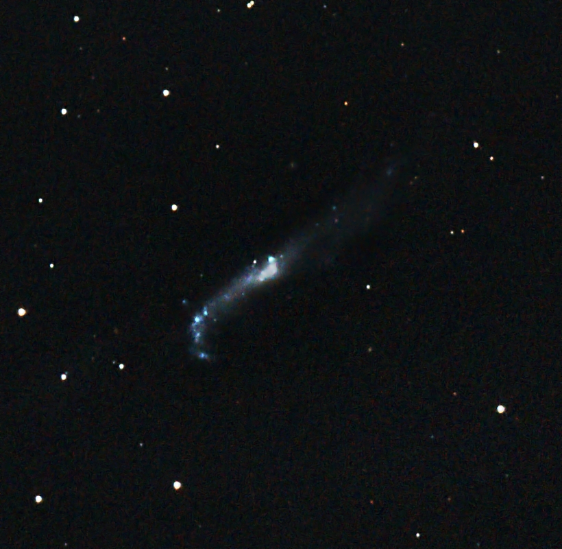 jetzt habe ich mich heute dazu durchgerungen, die Bearbeitung für diese doch recht ungewöhnlichen Galaxien fertig zu machen. Die linke, senkrecht stehende Galaxie NGC 4631 hat einen kleinen Begleiter NGC 4627, die beide in Wechselwirkung stehen, was vermutlich für die Form von NGC 4631 verantwortlich ist. NGC 4656 steht ebenfalls mit NGC 4631 in Wechselwirkung und ist daher verbogen wie ein Hockey-Schläger. In der Krümmung des Hockey-Schlägers befindet sich ein hellerer Knoten, welcher laut "The Internet Encyclopedia of Science" die NGC-Nummer 4657 erhalten hat. Dieser Knoten ist angeblich eine kleine Begleitgalaxie.
