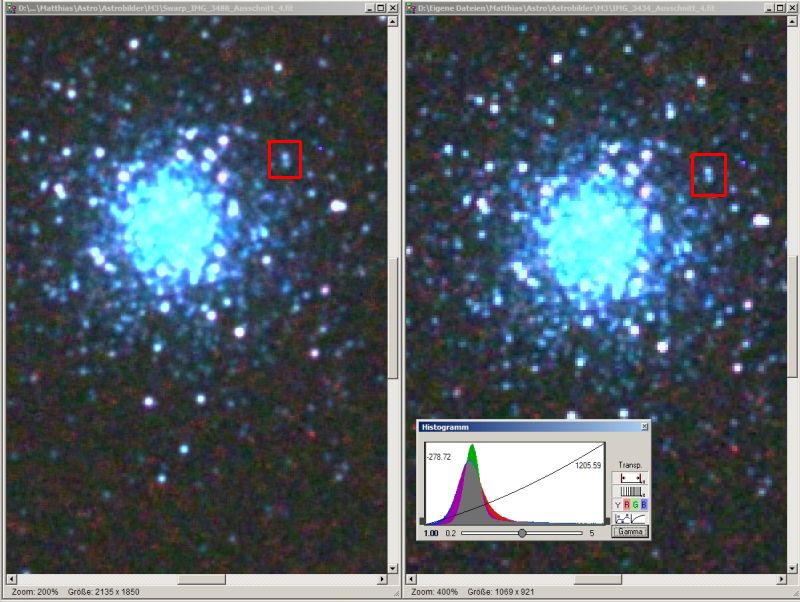 Übrigens, Dein M5 hat recht schöne Sternfarben, finde ich. Die Belichtungszeiten waren aber vermutlich zu lang, oder die ISO zu hoch, weil der Kern doch schon etwas ausgebrannt ist. Kugelsternhaufen sind da ja recht empfindlich ;). Vielleicht lässt sich da mit etwas Ruhe aber auch noch mehr rauskitzeln - ich habe den Eindruck, die Gradationskurve war irgendwo etwas stark gekrümmt - wegen dem starken Abfall vom hellen, zentralen Bereich in den etwas blau-grauen, mittleren Bereich. Die Sterne sind bei Dir aber jetzt recht rund, auch beim M3, das passt super.
