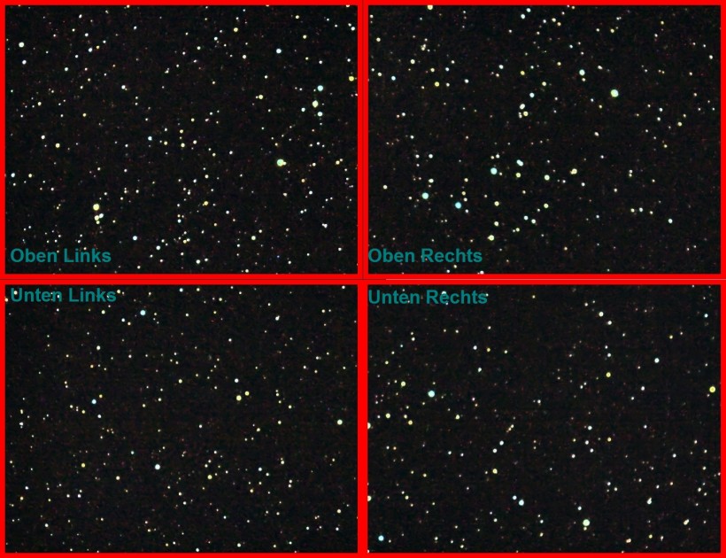 Interessant ist die Aufnahme aber auch wegen dem verwendeten Flattener für den ED80, der hier wirklich sehr gut zu sein scheint. Hier mal eine Ausschnittsammlung von allen vier Ecken aus dem oben gezeigten Bild: