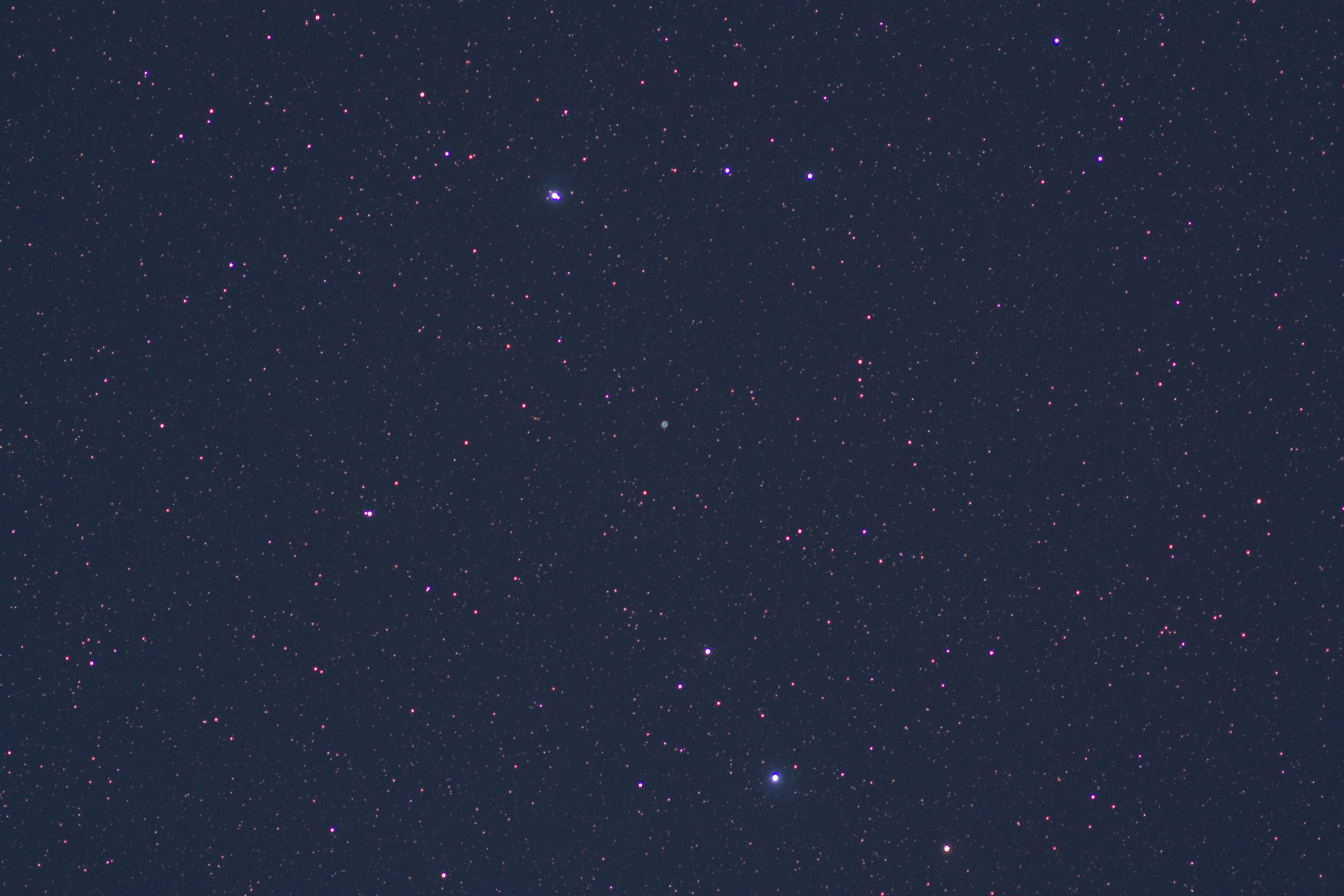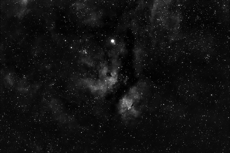 Da ich mir in der Schlechtqwetterperiode einen 12nm H-Alpha Clipfilter und ein Pentacon 300mm f/4 Objektiv geholt hatte, wollte ich natürlich gleich ein paar Tests machen. Eigentlich wollte ich den Cirrusnebel in H-Alpha ablichten, aber der wäre sicherlich erst um 1 überm Hausdach gewesen und da die Nächte ja leider ziemlich kurz sind und ich seit langem mal wieder Migräne hatte, hab ich dann auf IC1318 gezielt, der etwas eher erreichbar war und auch wunderbar in H-Alpha leuchtet. Nach Einstellen der Aufnahmeserie hab ich mich schlafen gelegt. Leider hatte ich keine Heizmanschette ums Objektiv gemacht, daher war durch Taubefall die Hälfte der Bilder nicht zu gebrauchen
