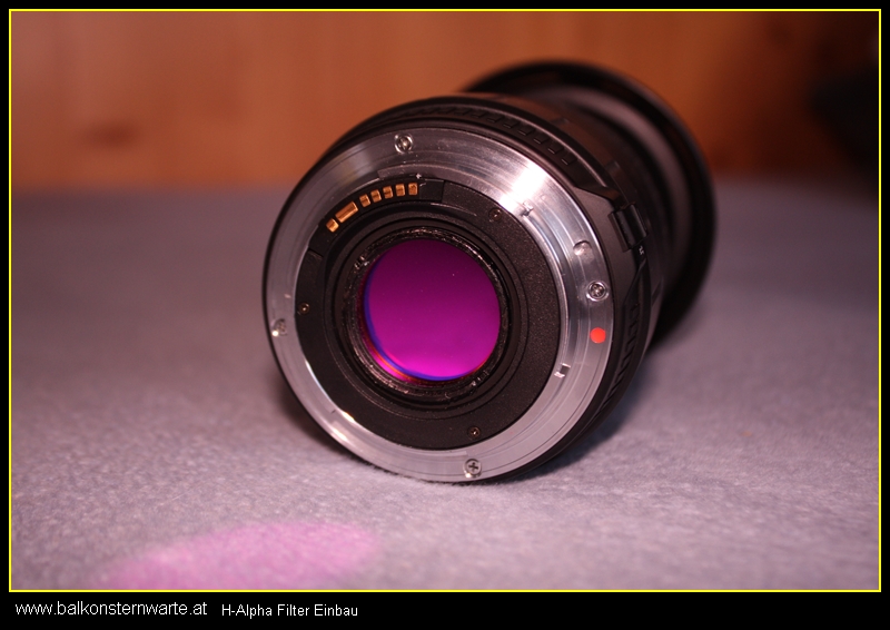 Da kann man besser sehen wie ich das angestellt habe. Das Hauptproblem was mir am meisten Sorge bereitet hat war dass der Filter auch wirklich drin hält, also nicht von selbst heraus fällt und mir womöglich noch die Kamera beschädigt. :shock: Deshalb opferte ich eine Filterfassung und baute mir daraus einen Haltering. Den hab ich aber in der Eile noch nicht so richtig geschwärzt, wie ich grade auf dem Bild sehe.