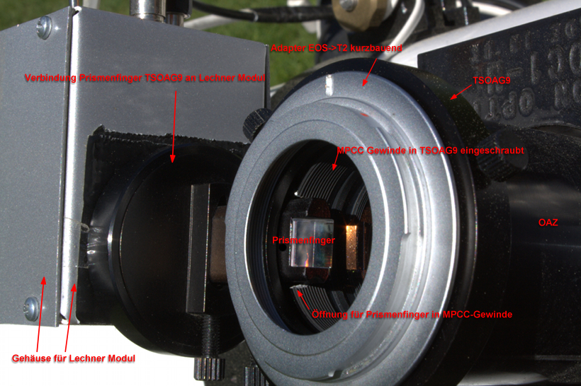 Da muss man was machen. Aber was? Ich habe mal probehalber den M48mm -> T2 Adapterring weg gelassen und den MPCC direkt adaptiert, aber damit läuft man in ein anderes Problem: Das Gewinde des MPCC ragt so weit in den TSOAG9, dass man dort den Prismenfinger nicht mehr in den Lichtkegel schieben kann! Der Adapterring dient also eigentlich nur dazu, dieses Problem zu umgehen. Mechanisch ist damit alles OK. Aber optisch...