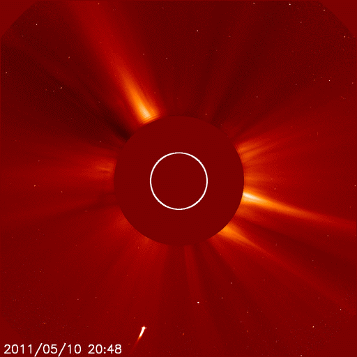 Auch wenn es so aussieht, der Komet hat keinen Einfluß auf die CME gehabt (wäre sonst vergleichbar mit der Aussage: ich hab in den NewYorker Hafen gespuckt und dadurch einen 20m Tsunamie an Australiens Küste hervorgerufen