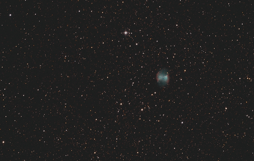 wie bereits bei Stefans M27 angekündigt war auch ich gestern auf Hanteljagd. Durch den hellen Mond kamen bei klaren Wetter nur Planetarische Nebel oder Kugelsternhaufen in Frage. Ich entschied mich für M27, weil er besonders hell ist. Ich habe die unmod. EOS 400 D am 6'' f/5 Newton auf der NEQ3 Synscan im Freilauf 55 Bilder a 180s bei ISO 800 machen lassen. Wegen durchziehender Wolken und Windböen konnte ich noch 32 Bilder verwenden.