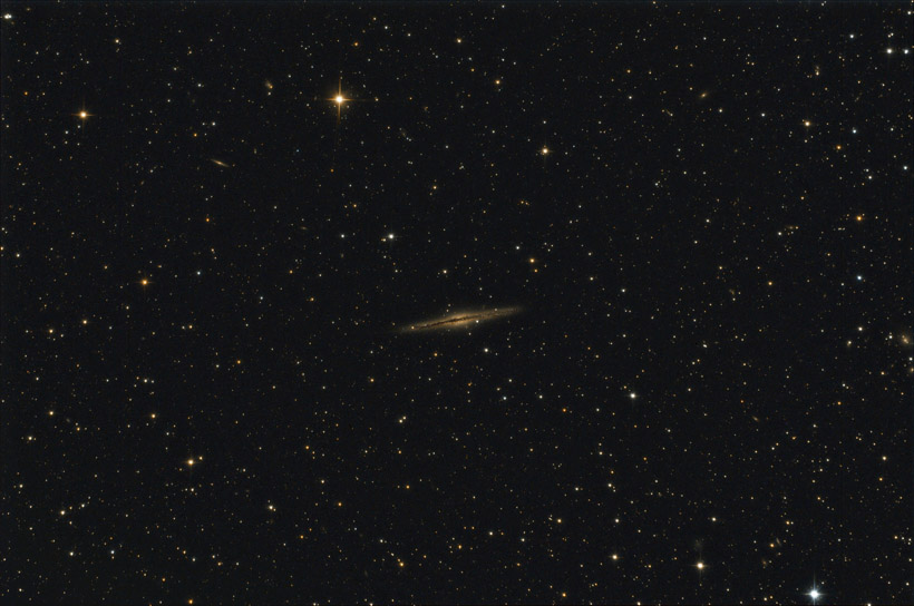 Ich wollte endlich mal meinen Sturmvogel (NGC6960) fertig machen, den ich immer mal zwischendurch mit Ha Filter abgelichtet hatte. Leider gab es dauernd Probleme mit dem Guiding oder irgendwas anderem. Zumindest sah der Guidinggraph sehr gut aus, aber die Sterne waren auf den 15min frames trotzdem total verzogen. Nach ewigem herumprobiere waren dann zumindest die Sterne im Zentrum einigermaßen punktförmig, aber die Ränder waren in verschiedene Richtungen verzogen. Da ich keine Lust hatte, das nächste mal wieder auf das gleiche Problem zu stoßen, hab ich die Aufnahmeserie dann abgebrochen und mich mit der Kamera und dem OAZ befasst. Nachdem ich die Kamera neu angeklemmt und ein wenig gedreht hatte, waren die Sterne dann nur noch in den Ecken leicht verzogen, was man aber auch nur in der 100% Ansicht bemerkt hat. Der Sturmvogel stand jedoch schon weit im Westen, daher habe ich ein neues Objekt im Osten gesucht und bin auf NGC891 gestoßen. Das Guiding lief hier wunderbar, die Sterne waren selbst bei 200% Ansicht punkt- bzw. quadratförmig. Der Fokus hat auch voll gepasst. So konnte ich, bis es dann gegen um 4 langsam zuzog noch ein paar Aufnahmen sammeln. Der Mond hat zum Glück nicht so stark gestört, wie ich befürchtet hatte.