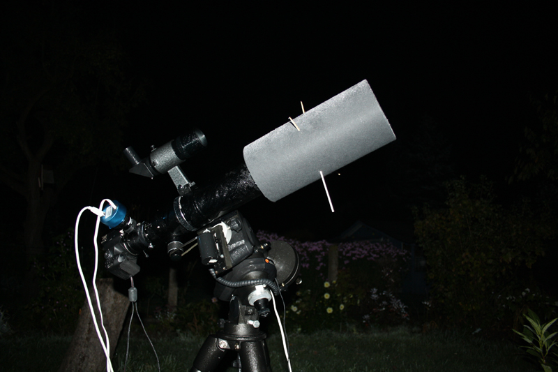 Diese Taukappe war nun immer auf dem C8, wenn ich es benutzt habe. Besonders kritisch war die Wetterlage nun im September/Oktober 2011. Da wollte ich mit dem C8 den Hantelnebel M27 aufnehmen. Also Monti raus, C8 + Leitrohr rauf und los gehts. Da ich die Nacht komplett ausnutzen wollte, habe ich die ganze Gerätschaft ab ca 02:00 laufen lassen und bin ins Bett.