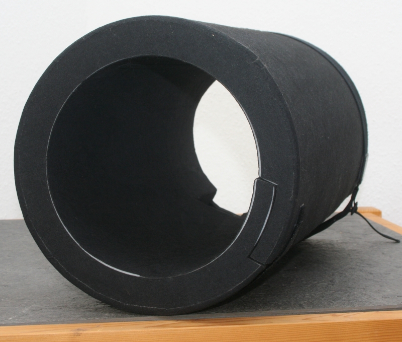 Die Taukappe von Schubi besteht im Wesentlichen aus einem sehr formstabilen Schaumstoff und ist innen und außen mit einer Art schwarzem Vlies ausgekleidet. Die Kappe ist an der Seite offen und hat innen eine Aussparung für die Prismenschiene. So kann sie mühelos über den Tubus gestülpt werden. Zum Befestigen wird dann einfach ein Riemen ringsum die Kappe zugezogen, dann sitzt die Kappe sicher. Die Kappe ragt dann ca 40 cm über die Teleskopöffnung hinaus.