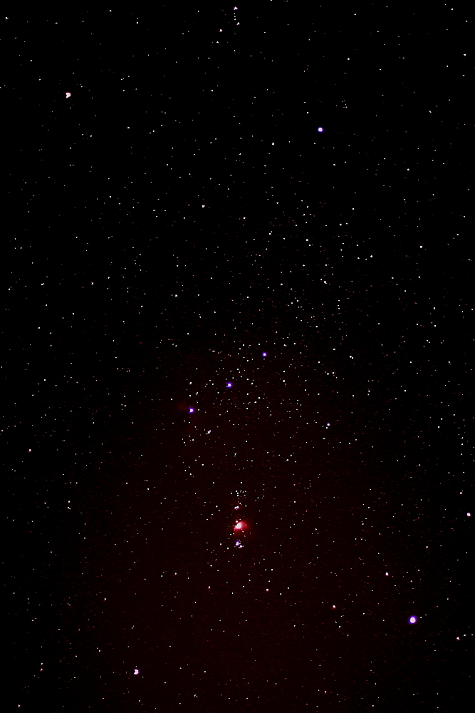 Das sieht ja eigentlich nicht sooo schlecht aus. Das KO-Kriterium war dann aber die Astroaufnahme an der 50 D (a) am Orion. Hier eine Einzelaufnahme mit Offenblende und 30 s. bei ISO 800. Es zeigt sich deutlich an z.B. Beteigeuze, wie unsymetrisch das Bild verzerrt wird.