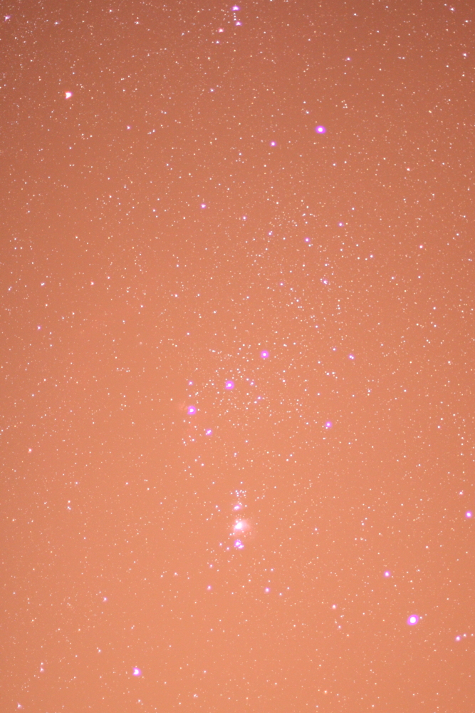 Das sieht ja eigentlich nicht sooo schlecht aus. Das KO-Kriterium war dann aber die Astroaufnahme an der 50 D (a) am Orion. Hier eine Einzelaufnahme mit Offenblende und 30 s. bei ISO 800. Es zeigt sich deutlich an z.B. Beteigeuze, wie unsymetrisch das Bild verzerrt wird.