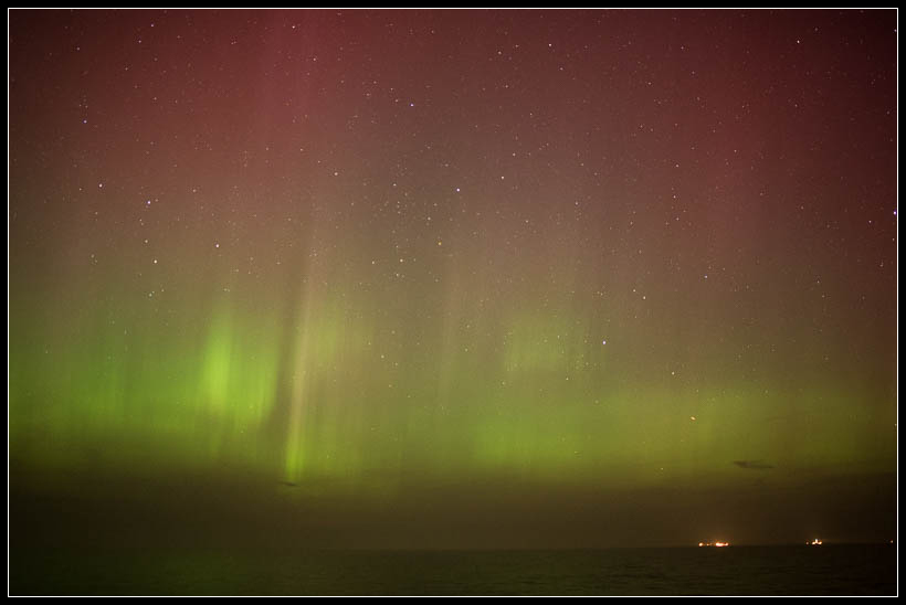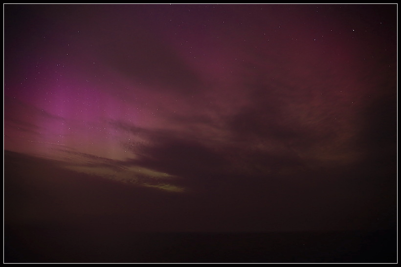 Eigentlich war ich noch am Regenerieren nach dem Polarlicht-Beobachtungsflug, aber als dann ein koronarer Massenauswurf hier eintraf, schnappte ich mir die Kameras und fuhr nach Strande. Am altbewährten Leuchtturm Bülk waren zeitweise bis zu 40 weitere Beobachter und Fotografen anwesend. Bereits um 19:30 Uhr konnte ich hinter einer Wolkendecke das erste Polarlicht auch visuell wahrnehmen. Im Laufe des Abends verzogen sich die Wolken und die Aktivität wurde immer stärker.