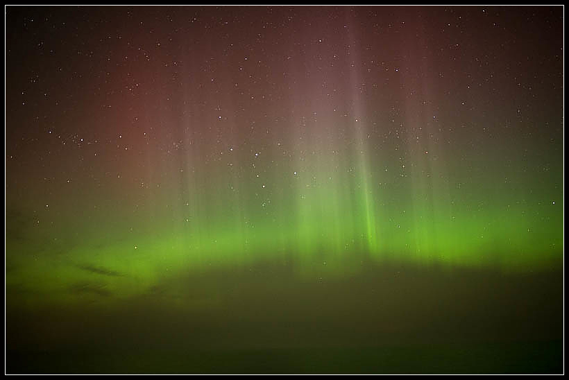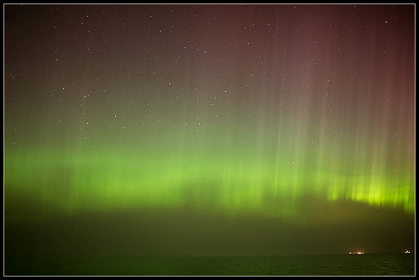 Der grüne Bogen war deutlichst auch visuell wahrzunehmen und von anfänglichen violetten Strahlen wandelte das Nordlicht später auf deutliche rote Färbungen. Nach späteren Berichten sollen die Polarlichter bis in die Alpen nachgewiesen worden sein. Hier, in der Nähe von Kiel, konnte man problemlos die wandernden Strahlen und sogar die Farben schwach wahrnehmen...