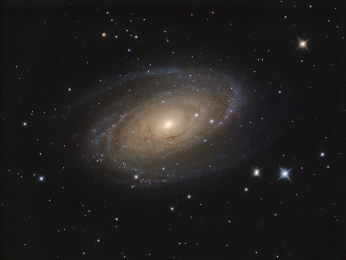 - Bei helleren Galaxien (Kontinuumstrahler) kommt nur noch der Baader Neodymium Filter für mich in Frage, der eine ausgewogene Farbbalance bietet, gleichzeitig aber etwas von der Himmelsaufhellung nimmt. Maximal 300s Belichtungszeit sind möglich. Die noch vorhandene Aufhellung im Summenbild lässt sich über EBV mildern.