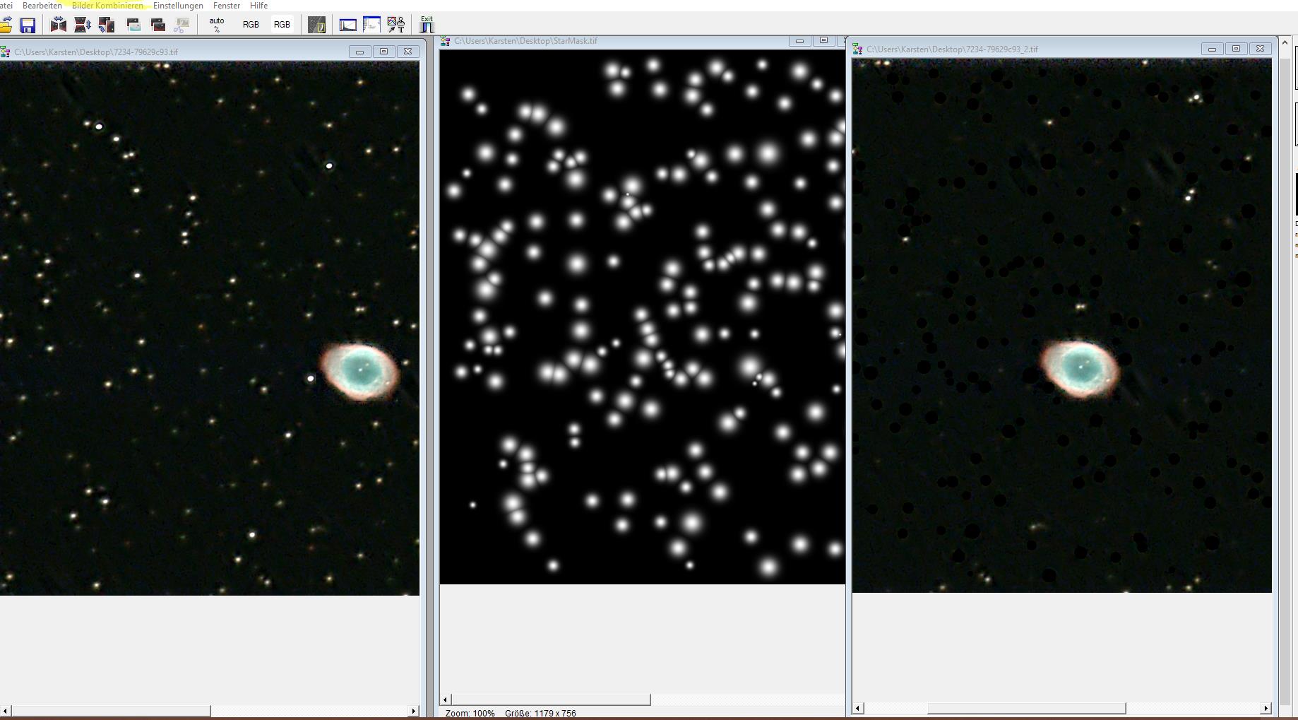 Beim Schärfen der Sterne entstehen ja sonst oft die unschönen Höfe. Kann man in Deinem Bild auch schon bei den helleren Sternen erkennen. Natürlich gibt es auch andere Möglichkeiten, diese Höfe zu vermeiden, aber die Sternmasken von Karsten sind eine einfache und wirkungsvolle Methode.
