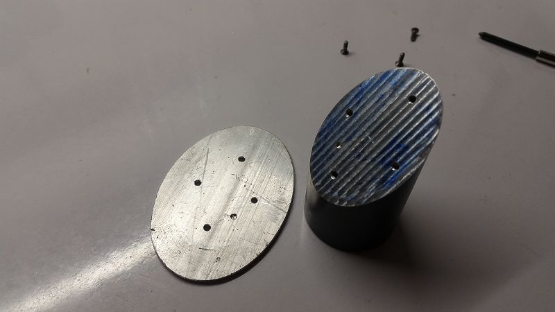 Da der Rundkörper noch bei der Fräse eingespannt war, habe ich die Löcher ausgemessen und gesetzt, diese Löcher müssen nun auch auf die Platte, das ist aber nicht so kritisch müssen aber auch gleiche Abstände haben sonst passen sie nicht.
