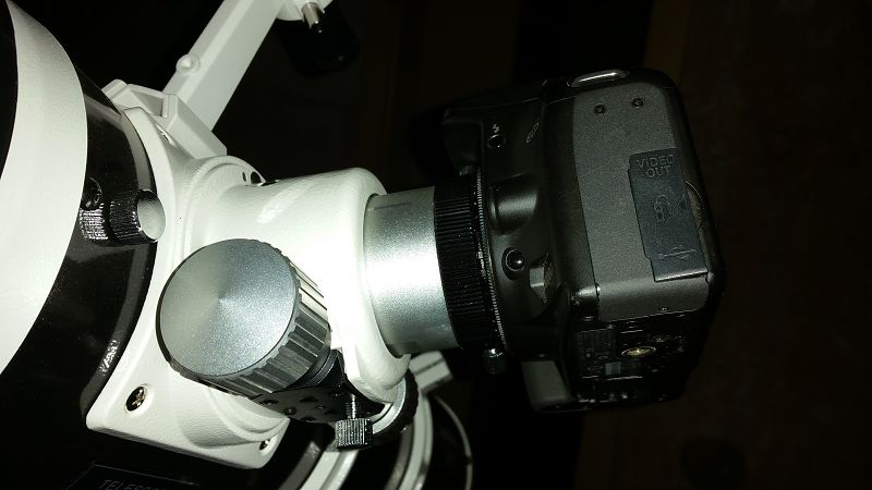 An dem Komakorrektor ist ein T2 Anschluss, ein eingeschraubter Ring, an meiner Kamera habe ich ein sehr flachen Adapter mit M42 Gewinde, jetzt müsste ich ein Zwischenring verwenden was den Okulartubus wieder nach innen zwingt.