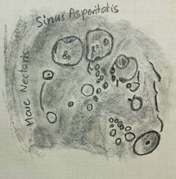Rund um das vom MARE NECTARIS und SINUS ASPERITATIS eingeschlossene Krater-Trio gibt es vieles zu entdecken. Im O gelegenen Krater THEOPHILUS ragen die drei Hauptsegmente Alpha, Phi und Psi bis zu 1400 m in die Höhe. Am NW-Kraterwall von Theophilus konnte ich den nur 8km großen Krater THEOPHILUS B ausmachen. Theophilus überlagert im W den Krater CYRILLUS, in dem ich die Segmente Alpha und Delta des Zentralgebirges bewundern konnte. Das kleine Zentralgebirge Eta konnte ich nicht eindeutig identifizieren. Der schon sehr alte und stark erodierte Krater CATHARINA wird im N vom 46 km großen Krater Catharina P überlagert. Im Ostwall reihen sich die beiden kleinen Krater Catharina B und G aneinander. Bei beiden war der Kratergrund nicht einsehbar. Am NW-Rand des Mare Nectaris liegt isoliert der Krater MÄDLER mit seinem kleinen Zentralberg. Zentral und von kleineren Einschlägen umgeben liegt der schon sehr verwitterte Krater BEAUMONT. Der Linie von Catharina nach S folgend gelangt man zum POLYBIUS. Im N von Polybius schließt sich eine kleine Kraterkette an, sodass der Umriss des Kraters ein wenig wie ein Apfel mit Stiel erscheint. Ganz im SW liegt der Krater PICCOLOMINI mit seinem ca. 2000 m großen Zentralgebirge. NO von Piccolomini reihen sich fast kreisförmig 9 Einschläge aneinander, die im Engl. als "Telephone Dial" bezeichnet werden. Ganz im W zieht sich die RUPES ALTAI 427 km von Catharina bis Piccolomini.