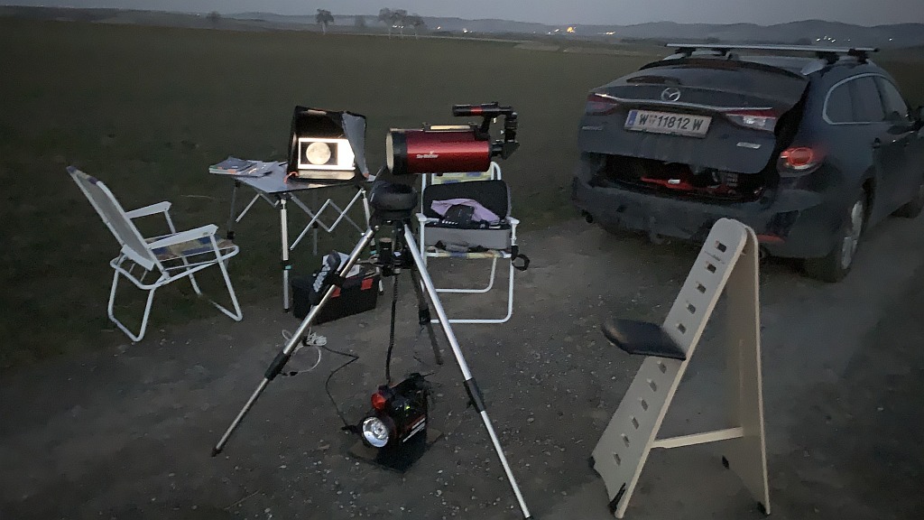 am vergangenen Freitag konnte ich endlich meine neue ZWO ASI178MC bei clear skies testen und habe dabei mal den Mond ins Visier genommen. Um 17:30 packte ich meine Ausrüstung ins Auto und fuhr um 18:00 Uhr los nach Großmugl (16,2 Grad Ost/48,5 Grad Nord). Den Beobachtungsort erreichte ich noch vor der Dämmerung, sodass mir für das Aufbauen ausreichend Zeit blieb.