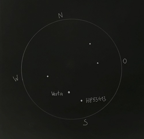 Von der Hydra wanderte ich zum Leo, wo ich um 23:45 Vesta beobachtete. Der nur ca. 500km große Asteroid war mit freiem Auge sichtbar und bildet mit Zosma (Delta Leo) und Chort (Theta Leo) ein spitzwinkeliges Dreieck. Die nachstehende Zeichnung zeigt Vesta (6,2 mag) im Umfeld von HIP 53413 (8,7 mag) und anderen Sternen mit scheinbaren Helligkeiten zwischen 9 und 10 mag.