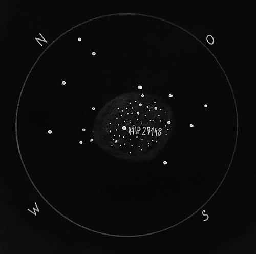 Der 5 mag helle offene Sternhaufen, der auch den klangvollen Namen "Shoe-Buckle-Cluster" trägt, ist 2800 Lichtjahre von unserem Heimatplaneten entfernt. Mit 94-facher Vergrößerung konnte ich im Sternhaufen die helleren Sterne gut auflösen und zahlreiche lichtschwächere Sonnen ausmachen. Im Zentrum der Zeichnung steht der 8 mag helle Stern HIP 29148. Alle anderen größer dargestellten Sterne sind zwischen 7-11mag hell, die kleinen Pünktchen leuchten alle schwächer als 12 mag.