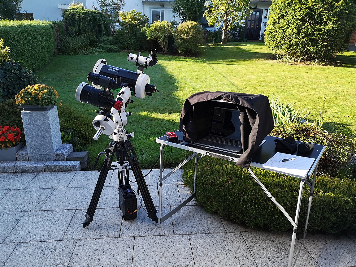 Das sind meine beidem Schätzchen. Einmal eine Rubinar Makro Russentonne mit 5,6/500mm mit der ich Übersichtsaufnahmen von Sonne und Mond mache. Und dann mein Skymax 150/1800 für die Details. Die Montierung steht auf einem Manfrotto Profi Stativ mit einer 75 mm Kugelhalbschale. Dadurch bin ich in der Lage, die Montierung und ein paar Sekunden in Waage auszurichten, egal wie das Stativ in der Gegend steht. Norden sehe ich nicht, bei mir wird "eingesüdet".