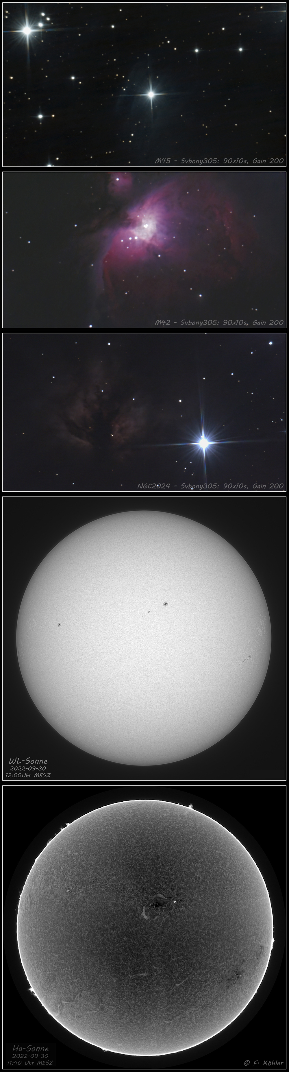Für die ersten 4 Bilder kam der Newton zum Einsatz. Bei den Sonnenbilder habe ich die ASI178mm verwendet. Das letzte Bild (Coronado PST) ist nur zum Vergleich mit der WL-Sonne mit drauf. Die Sonnenbilder hab ich ja schon anderweitig mit eingestellt. Es geht ja in zweiter Linie auch um 'kleine Technik'.