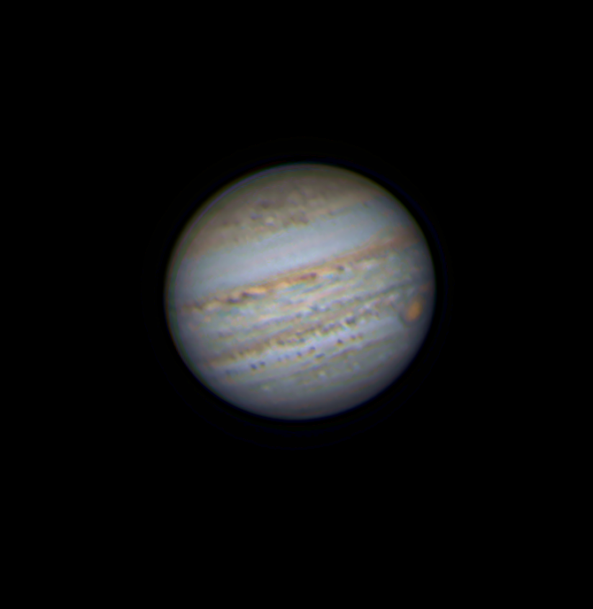 Ich hatte am 22. auch Jupiter auf dem Korn gehabt, leider ist das Seeing immer noch nicht besser geworden, die Sterne haben bis in den Zenit geflimmert. Trotzdem hab ich nach einigen Anläufen eine "brauchbare" Version zusammenbekommen: