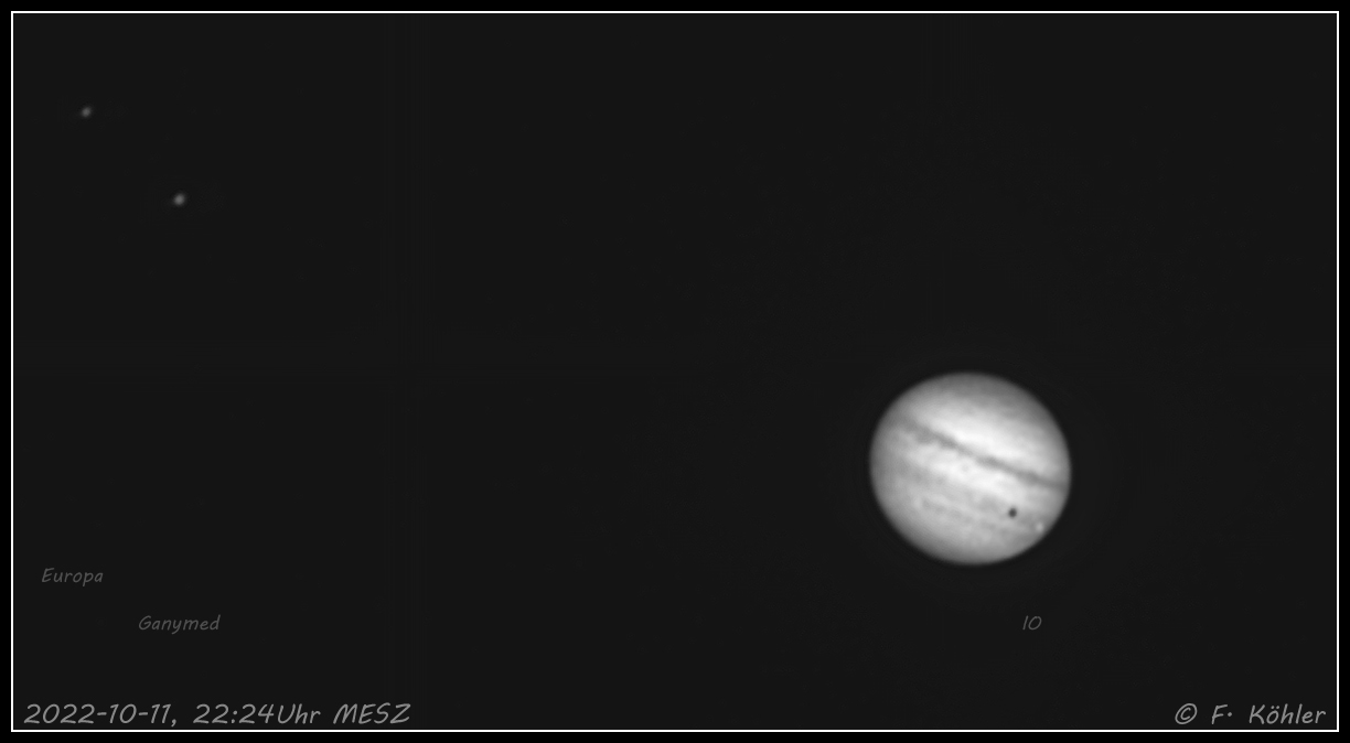 Zu meiner Überraschung waren dann die Videosequenzen relativ brauchbar. Ich wollte schon wieder aufhören, als mich ein dunkler Punkt auf Jupi störte. Ich dachte schon an ein Staubkorn odgl. Leider hatte ich im Vorfeld Stellarium nicht bemüht, sonst hätte ich gleich gesehen, dass es sich um einen Mondschatten (nämlich von IO) handelt. So habe ich dann für die nächsten 2,5Std. in Sharpcap eine Sequenz mit Intervall alle 3min eingestellt und die Jupiposition in den Intervallpausen immer mal nachkorrigiert.