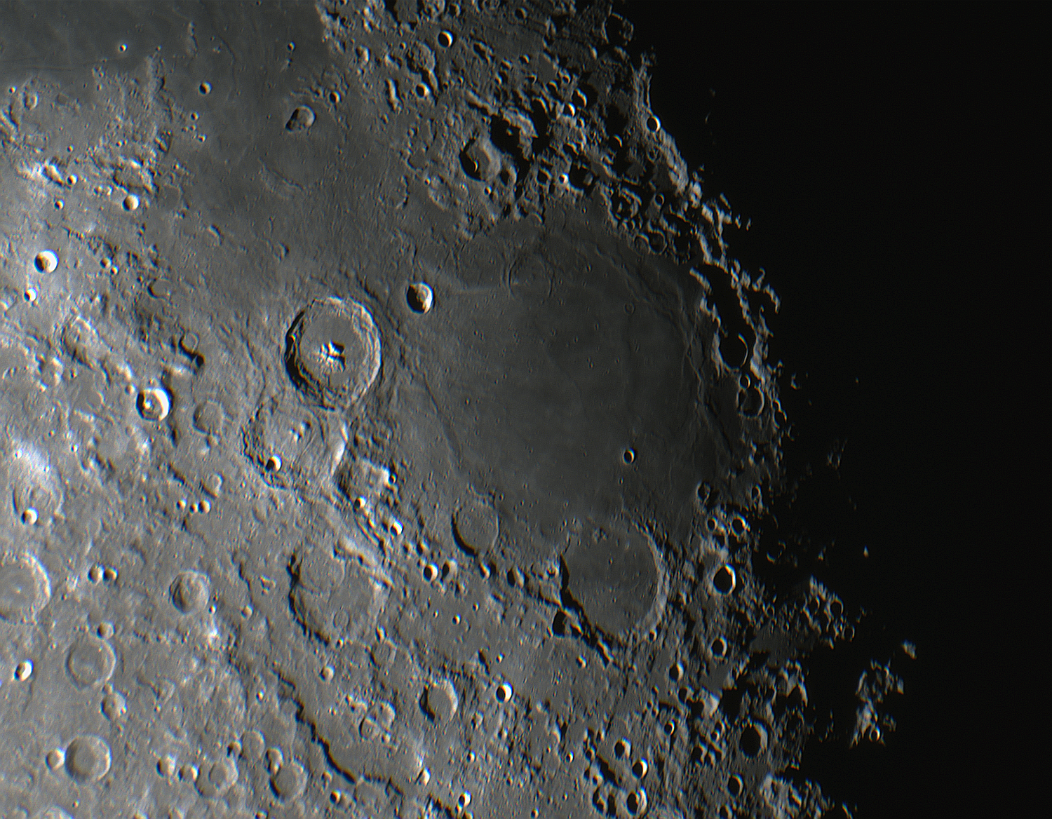 Visuell beobachtete ich mit dem Omegon Super LE Okular f = 7 mm (V = 143x) und dem TeleVue Delos Okular f = 3,5 mm (V = 286x). Das Kratertrio Theophilus, Cyrillus und Catharina westlich des Mare Nectaris war von der Sonne bereits voll ausgeleuchtet, die Zentralgebirge waren aber gut sichtbar. Im Osten verdeckte der Terminator Auch die versunkenen Wälle des Geisterkraters Daguerre im Norden des Mare konnte ich gut erkennen. Sehr interessant waren auch die zahlreichen kleinen Einschläge am Boden des Mondmeeres. Südlich des Mare Nectaris befindet sich die "Telephone Dial", eine kreisförmige Anordnung von 9 Kratern, die an eine Telefon-Wählscheibe erinnern. Südwestlich des Mare Nectaris baut sich die bis zu 4000 Meter hohe Rupes Altai auf.