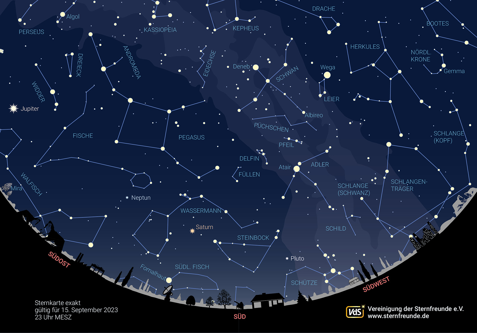 Im September 2023 werden die Nächte früher dunkler als in den Sommermonaten, wobei die meisten Sternbilder bereits gegen 21:30 Uhr sichtbar sind. Einer der ersten Sterne, der ins Auge fällt, ist der helle Stern Wega, der sich direkt über uns befindet. Wenn man später noch einmal hinschaut, wenn es vollständig dunkel ist, kann man auch das kleine rautenförmige Sternbild Leier sehen, in dem Wega der hellste Stern ist. Wenn man die Leier nicht sieht, hat man vielleicht Wega mit dem Stern Atair (im Sternbild Adler) oder Deneb (im Sternbild Schwan) verwechselt. Zusammen bilden Wega, Atair und Deneb ein großes Dreieck, das als “Sommerdreieck” bezeichnet wird.