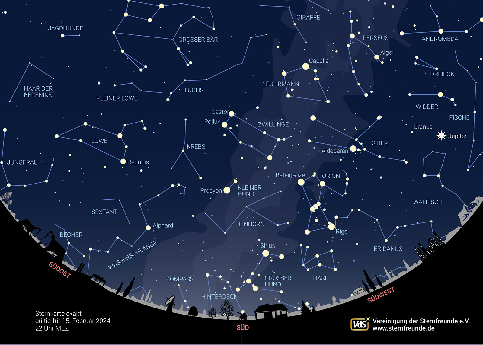 In den Abendstunden des Februar funkelt der Sternenhimmel ordentlich: Die Wintersternbilder rund um den Himmelsjäger Orion sind berühmt für ihre hellen Sterne. Um 22 Uhr (diesen Anblick zeigt die Sternkarte) sind diese Sternbilder bereits über den Meridian gezogen. Unter dem Orion flackert mit Sirius im Großen Hund der hellste Stern des gesamten Himmels. Über dem Orion findet man rechts den Stier mit seinem Hauptstern Aldebaran, noch höher am Himmel den Fuhrmann mit der gelblichen Capella und links oberhalb des Orion die Zwillinge mit den beiden hellen Sternen Castor und Pollux. Unterhalb der Zwillinge leuchtet mit Prokyon der hellste Stern im Kleinen Hund.