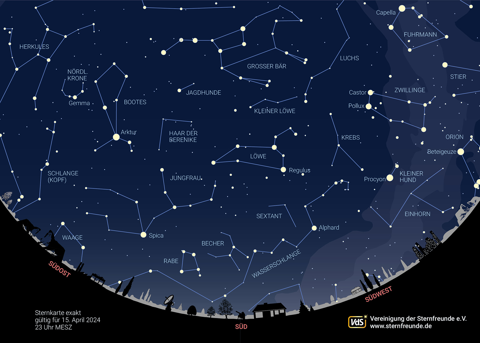 In südöstlicher Richtung sorgen zwei Lichter für Aufmerksamkeit: Spica, Hauptstern der Jungfrau, und höher am Himmel der orange Arktur im Sternbild Bootes. Arktur, Spica und Regulus spannen das sogenannte Frühlingsdreieck auf.