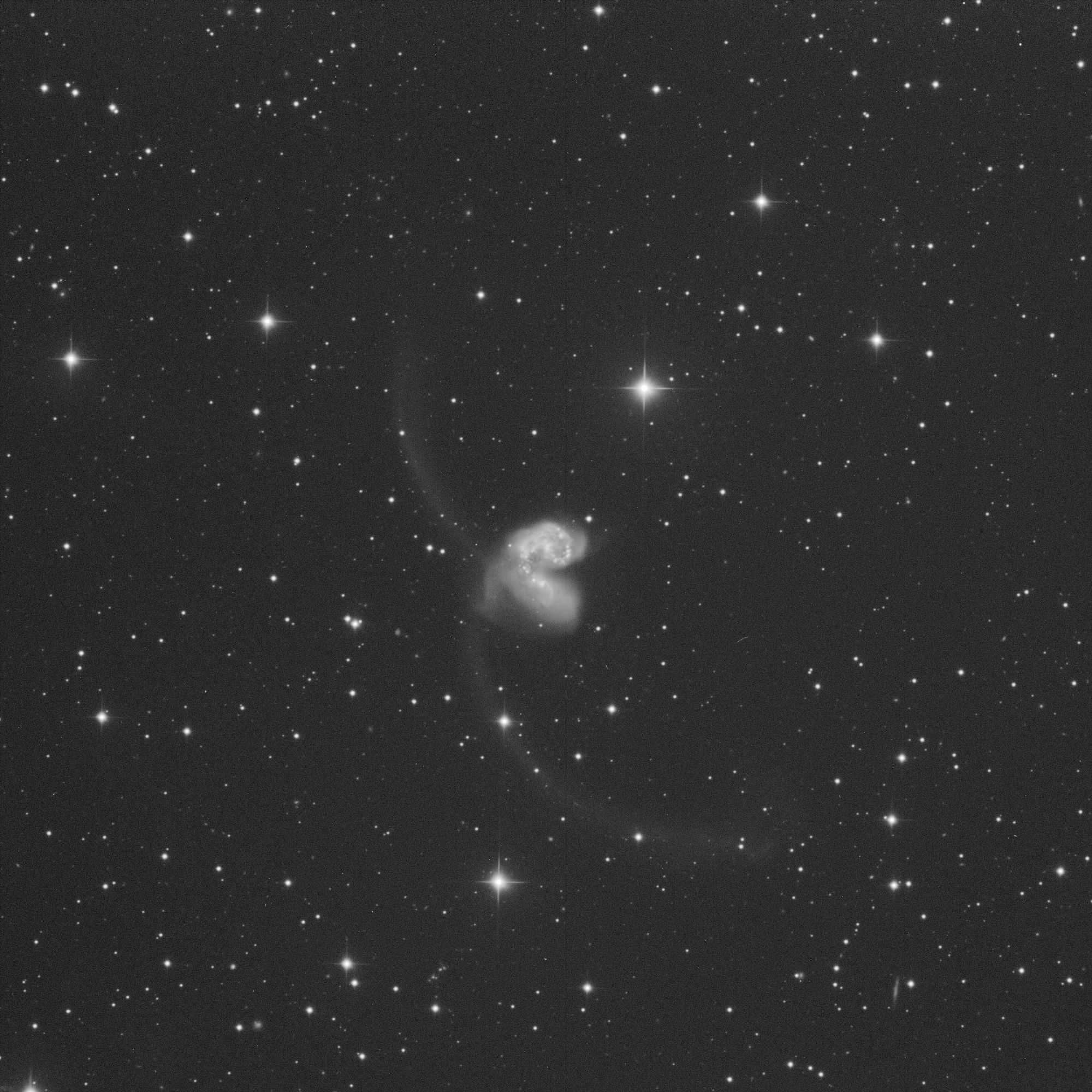 Das Bild zeigt die beiden verschmelzenden Galaxien NGC 4038 und NGC 4039 mit den schönen Sternentstehungsgebieten. Die sternentstehung wird durch den Verschmelzungsprozess ausgelöst.