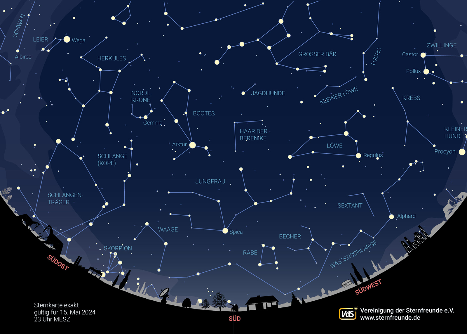 Sobald es abends dunkel wird, findet man das Sternbild Jungfrau über dem Südhorizont. Ihr hellster Stern trägt den Namen Spica. Ein Stück weiter oben am Himmel funkelt Arktur, der hellste Stern im Sternbild Bootes, dem Rinderhirten. In südwestlicher Himmelsrichtung fällt Regulus im Löwen auf. Die drei Sterne Spica, Arktur und Regulus bilden zusammen das sogenannte Frühlingsdreieck. Etwas oberhalb des Frühlingsdreiecks findet man das blasse Sternbild Haar der Berenike. Zum Südosthorizont hin kündigt sich der Übergang vom Frühlings- zum Sommersternhimmel an. Knapp über dem südöstlichen Horizont geht der Skorpion auf.